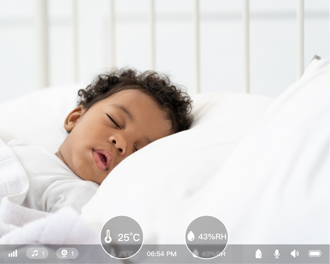 Überwachen Sie die Umgebung Ihres Babys mit Echtzeit-Updates zu Temperatur und Luftfeuchtigkeit.