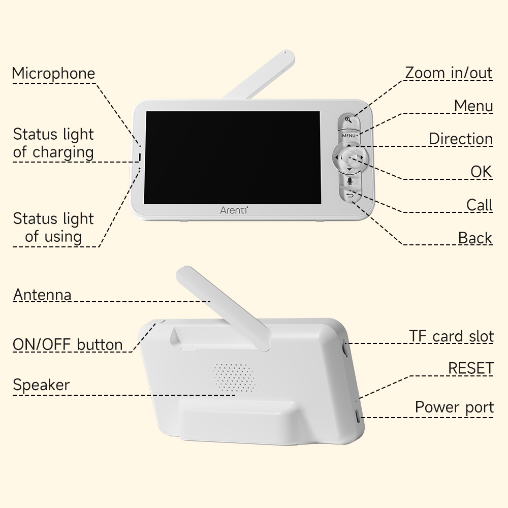 Die Taste an der Kamera dient zum Anrufen per Knopfdruck. Durch Drücken dieser Taste wird eine Gegensprechanlage aktiviert, sodass Ihr Kind oder die Betreuungsperson Sie sofort über den Monitor oder die App erreichen kann.